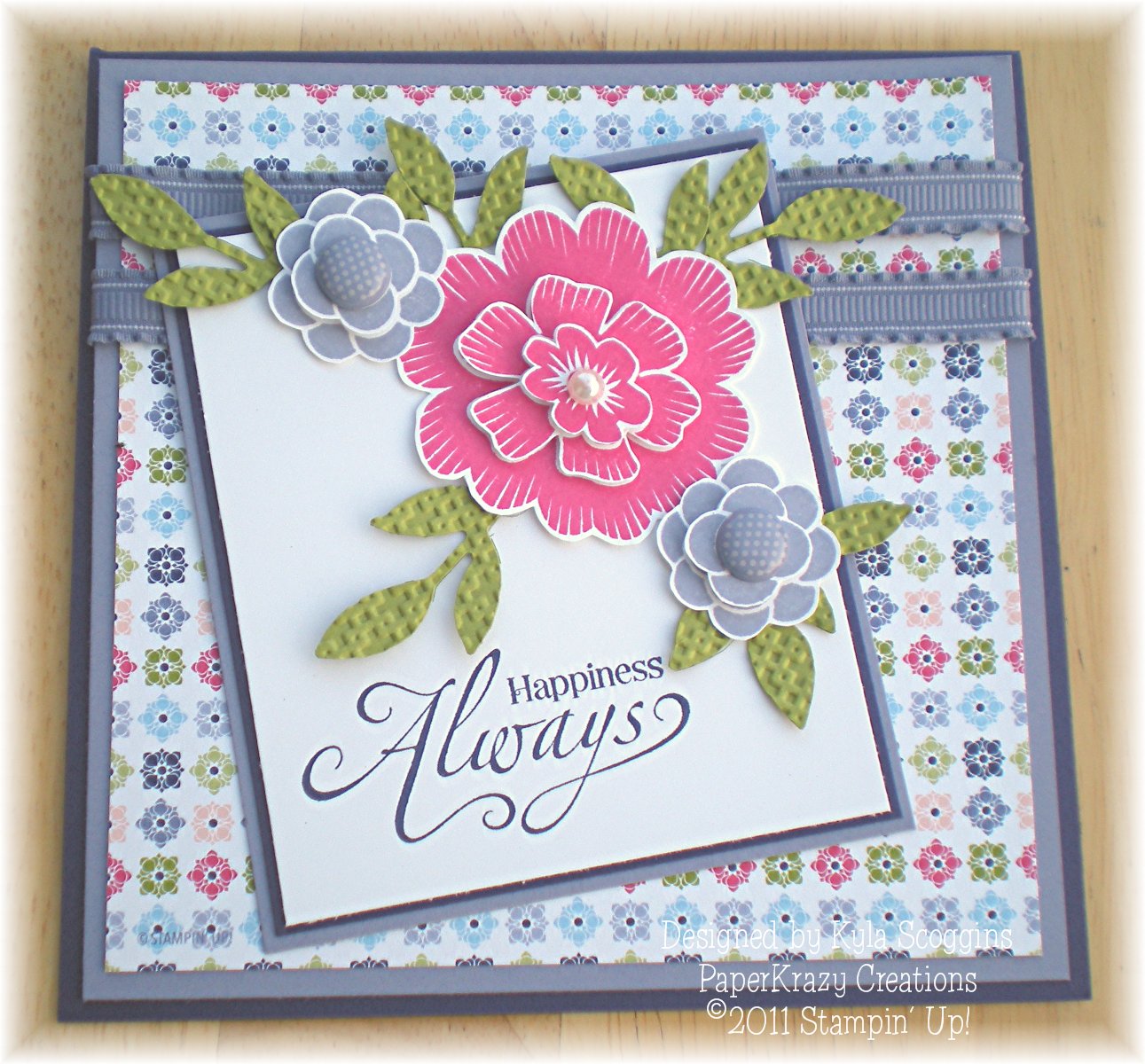 This last one for today is almost an exact CASE from a very talented blogger named Vicki Burdick of the "It's a Stamp Thing" blog. I love her work and the day she posted this delightful card, I knew I was going to make it without changing very much at all. I LOVE how it all came together. The good news about this card is that the only thing on it that will be gone when the Summer Mini ends is the sentiment which comes from the Happy Greetings stamp set. The flower is from the Array of Sunshine hostess set (in the main catalog) and that gorgeous paper is also a hostess rewards offering. It is part of the Cheerful Treat DSP. I especially loved her idea of embossing the Little Leaves die cut for added texture. I stamped the flowers several times and then popped the layers up on Dimensionals.